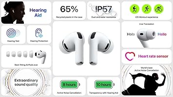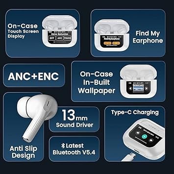 Auriculares inalámbricos TWS con cancelación de ruido activa (ANC) (32 dB), pantalla táctil inteligente, carga rápida tipo C, Bv5.4, función "Buscar mis auriculares", 4 micrófonos ENC para llamadas nítidas, modo transparencia, modo ecualizador.