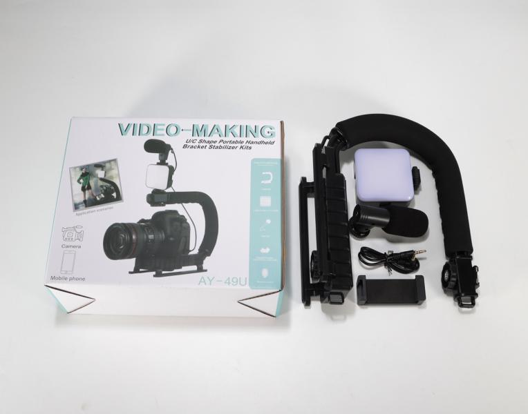 Este es un kit de creación de video con estabilizador de mano portátil AY-49U para cámaras y teléfonos móviles.